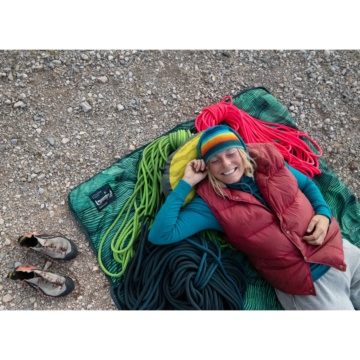 Het is geschikt voor kamperen bij zacht weer en op het strand of overal waar wat extra warmte en functie gewenst is. Met kliklussen rond de rand om te verbinden met andere dekens, quilts, lakens of de Mattress Snap Kits van Therm-a-Rest.