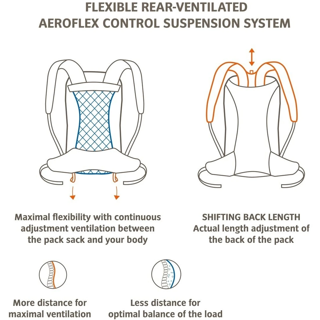 Optimaal verstelbare wandelrugzak voor meer comfort tijdens huttentochten. Het gebruiksvriendelijke Aeroflex Control-draagsysteem houdt je rug goed geventileerd tijdens zweterige beklimmingen en zit comfortabel tegen je lichaam tijdens afdalingen. Met het Shifting Back Length-systeem kun je ook de achterkant van de rugzak aanpassen aan je eigen lengte.